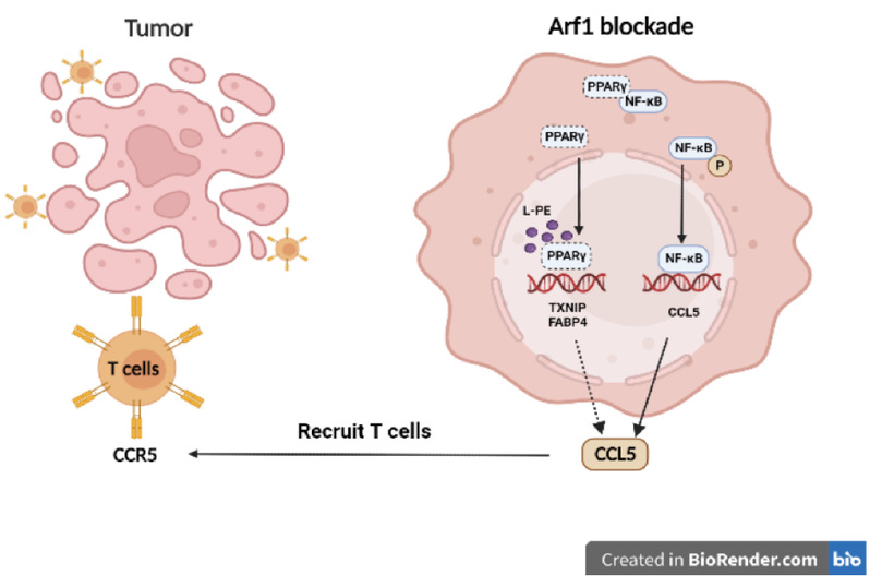 综上所述,阻断 Arf1 会诱导产生不饱和脂肪酸(LPE),这种脂肪酸能结合 PPARγ 并将其从胞质PPARγ-NF-κB复合体中“夺取”出来。被“释放”的NF-κB发生磷酸化并转运到细胞核中,从而调节趋化因子 CCL5 的转录。CCL5 与细胞毒性T细胞表面的CCR5受体结合进而招募其浸润到肿瘤中去,最终消退肿瘤(图1)。因此,通过阻断Arf1调控LPE-PPARγ-NF-κB-CCL5轴能有效促进杀伤性T 细胞迁移至肿瘤内部从而发挥抗肿瘤作用,这可能为肿瘤免疫疗法提供一种新策略。