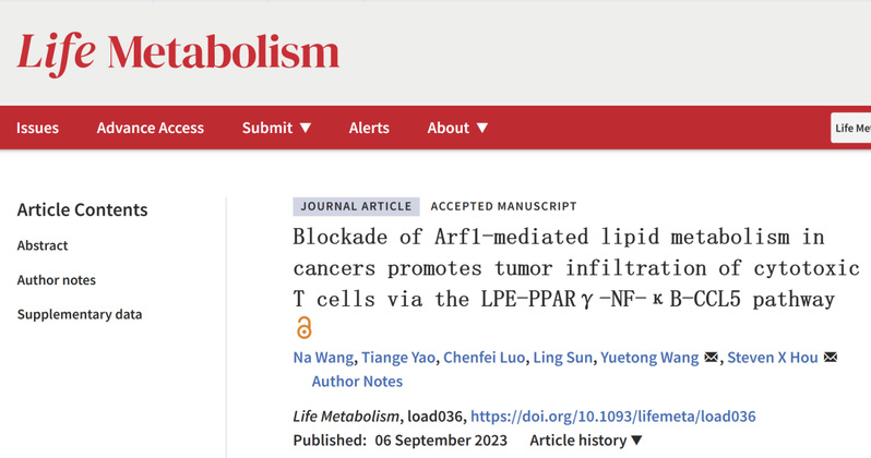 2023年9月6日,侯宪玉教授研究团队在Life Metabolism杂志上发表题为Blockade of Arf1-mediated lipid metabolism in cancers promotes tumor infiltration of cytotoxic T cells via the LPE-PPARγ-NF-κB-CCL5 pathway的研究论文。团队前期研究发现敲除Arf1介导的脂代谢过程能有效杀死肿瘤以及癌症干细胞(CSCs),并激发抗肿瘤免疫反应【6】。本项研究工作则重点解析了阻断Arf1如何通过影响脂代谢从而促进细胞毒性T淋巴细胞在肿瘤内部浸润,进而诱发抗肿瘤免疫应答的作用机制。这将为高表达Arf1的癌症患者提供一个新的治疗选择,并可能辅助现有的免疫疗法改善患者临床治疗效果。
